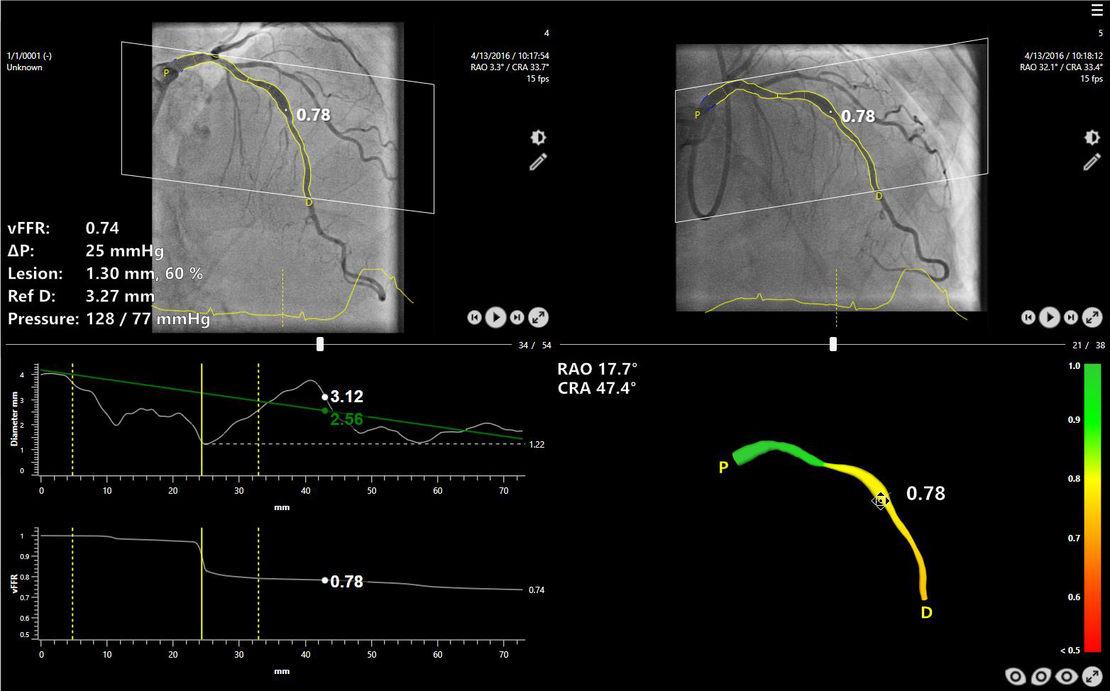 CAAS vFFR (судинний фракційний резервний кровотік, так званий віртуальний) обчислює падіння тиску в коронарних судинах без необхідності використання провідника з датчиком тиску. Модуль vFFR будує 3D-реконструкцію на основі двох ангіографій і оцінює падіння тиску, в результаті чого отримує значення vFFR. Крім того, 3D-реконструкція дозволить оцінити ступінь тяжкості та відсоток стенозу.