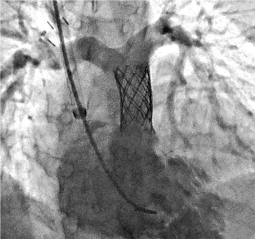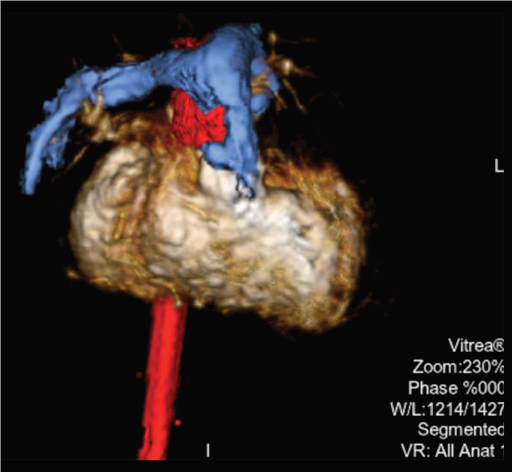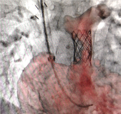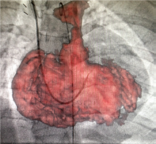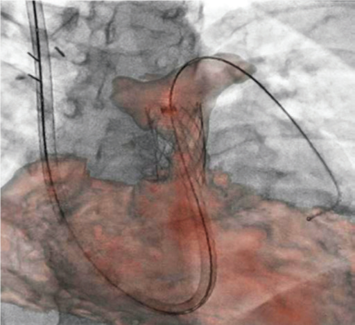 Накладений 3D об‘єм полегшує маніпуляцію катетером через складну анатомію пацієнта, допомогає точно розташувати стент і клапан легеневої артерії.