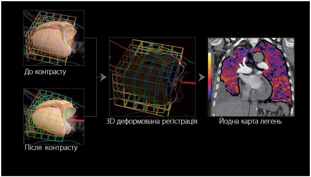 Ключовим в отриманні точних результатів є анатомічно обґрунтований алгоритм тривимірної реєстрації деформованих зображень, який компенсує рух пацієнта, що може виникнути між двома скануваннями. Це забезпечує високоточну ідентифікацію сигналу йоду, при цьому результат накладається на постконтрастне зображення КТ-ангіографії як колірне накладання, щоб чітко продемонструвати навіть незначні відмінності в ослабленні Одиниць Хаунсфілда.