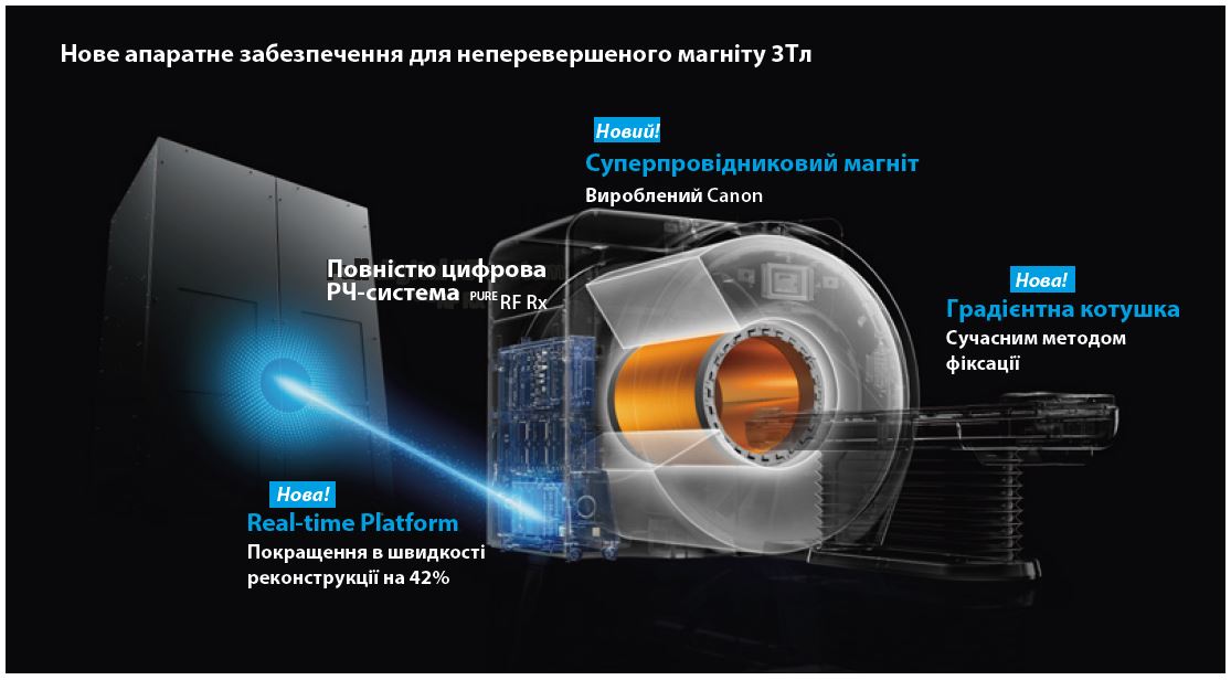 В основі лежить магніт 3 Tесла вироблений в Японії, налаштований для забезпечення високої однорідності магнітного поля та стійкості до квенчу, що забезпечує велике поле огляду для широкого клінічного застосування. Перероблена архітектура градієнтної системи зменшує вібрацію та акустичний шум, а також покращує ефективну продуктивність градієнтів, що дозволяє виконувати швидші та якісніші послідовності.