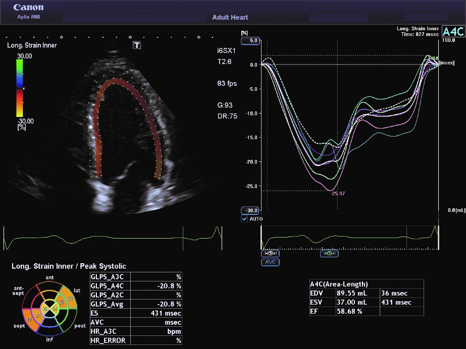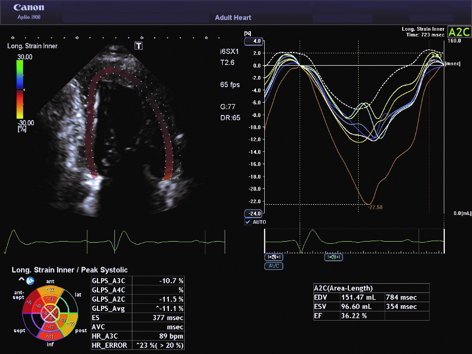 Системи серії Aplio i та Aplio a від Canon дозволяють швидко та легко оцінити GLS за допомогою стандартних апікальних 4-камерних, 2-камерних зрізів і зрізів по довгій осі.