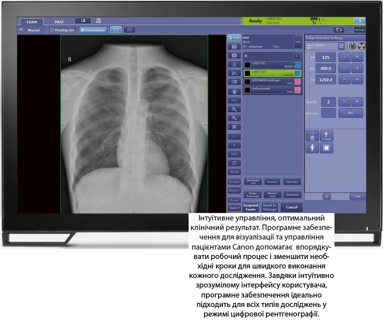 Програмне забезпечення CXDI NE v2.16 створене виключно для використання з бездротовими детекторами Canon серії CXDI і допомагає оптимізувати робочий процес та зменшити кроки, необхідні для завершення дослідження.