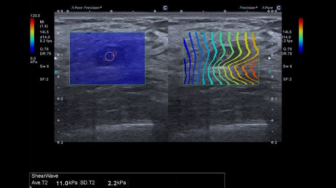Еластографія зсувною хвилею (SWE) демонструє різницю жорсткості між фіброаденомою молочної залози та навколишньою тканиною
