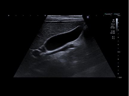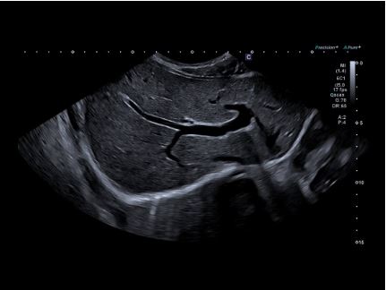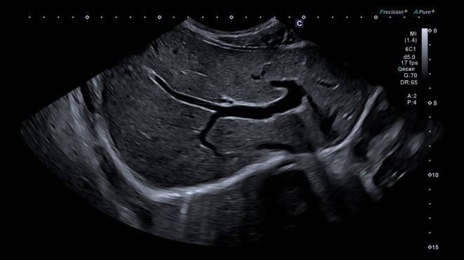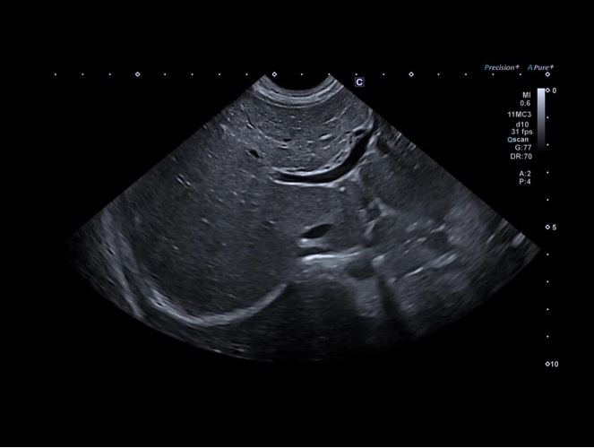 Печінка у дітей з однорідним зображенням від ближнього до дальнього поля та зліва направо по всій області зображення
