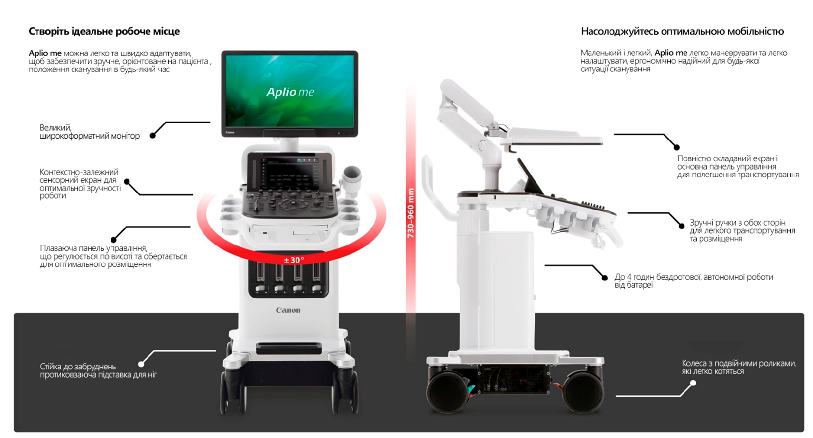 Широкий діапазон повороту та висоти панелі управління та монітора робить Aplio me ергономічним і простим у використанні для всіх користувачів сидячи, стоячи або сканування під час переміщення в інше приміщення.