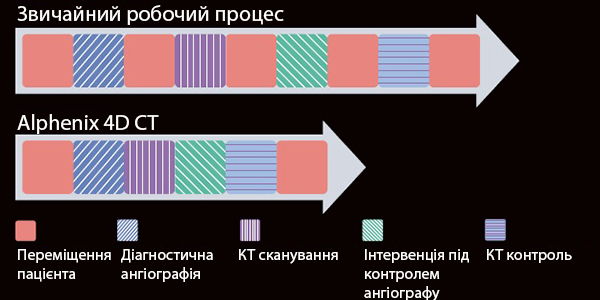 Із використанням системи Alphenix 4D CT немає необхідності переводити пацієнтів між кімнатами для підтвердження розміщення пристрою або ефективності процедури. Перемикання між КТ та ангіосистемою відбувається плавно і швидко. Обидві системи також можна використовувати в тандемі без необхідності паркувати одну з них.