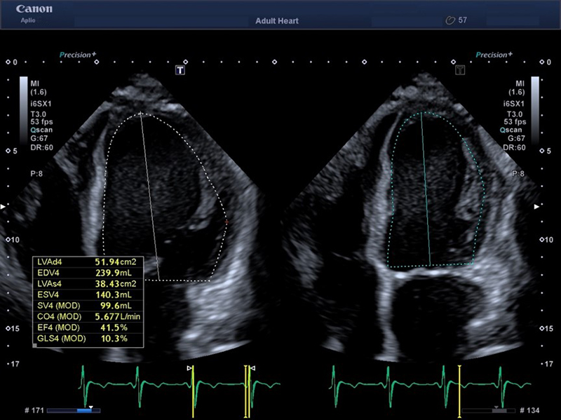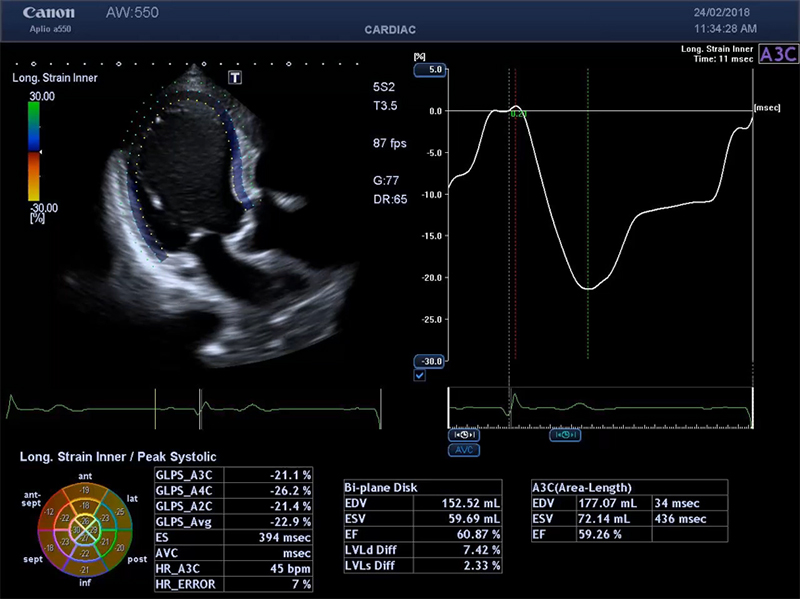 Система дозволяє оперативно провести якісну і кількісну оцінку загальної і локальної скоротливості міокарда в двовимірному режимі. Використовуючи технологію відстеження деформації для швидкого оцінювання функцій лівого шлуночку, вона дозволяє швидко отримати високоточні діагностичні результати та на ранніх стадіях виявити серцеву недостатність та дисфункцією лівого шлуночка серця.