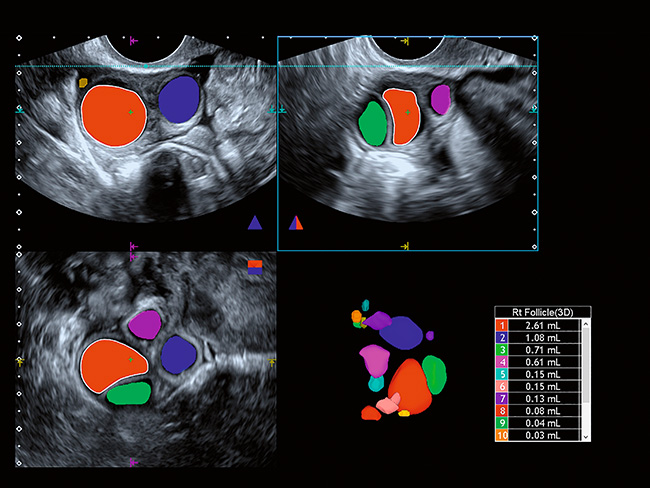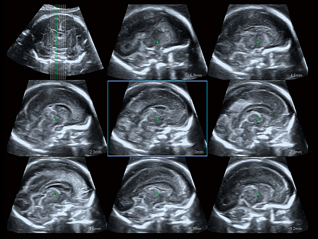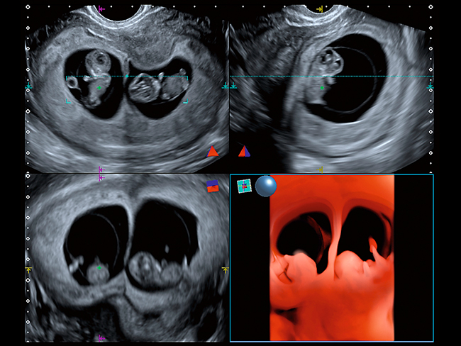 Якісна об'ємна візуалізація з високою роздільною здатністю може допомогти оцінити вагітність вже на перших етапах життя. В цьому прикладі - дихоріонічна вагітність з двійнятами на 9 тижні, де чітко визначена перегородка між обома мішками.