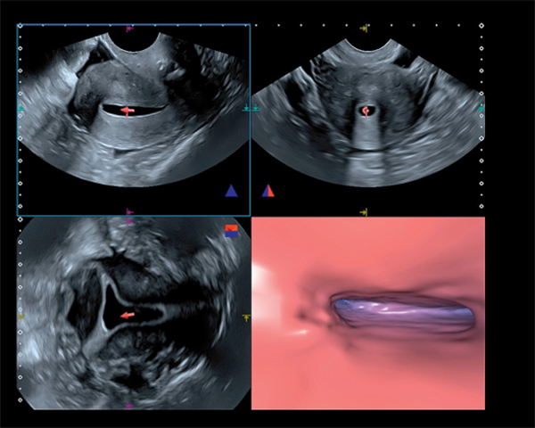 Якісна об'ємна візуалізація з високою роздільною здатністю може допомогти оцінити вагітність вже на перших етапах життя. В цьому прикладі - дихоріонічна вагітність з двійнятами на 9 тижні, де чітко визначена перегородка між обома мішками.